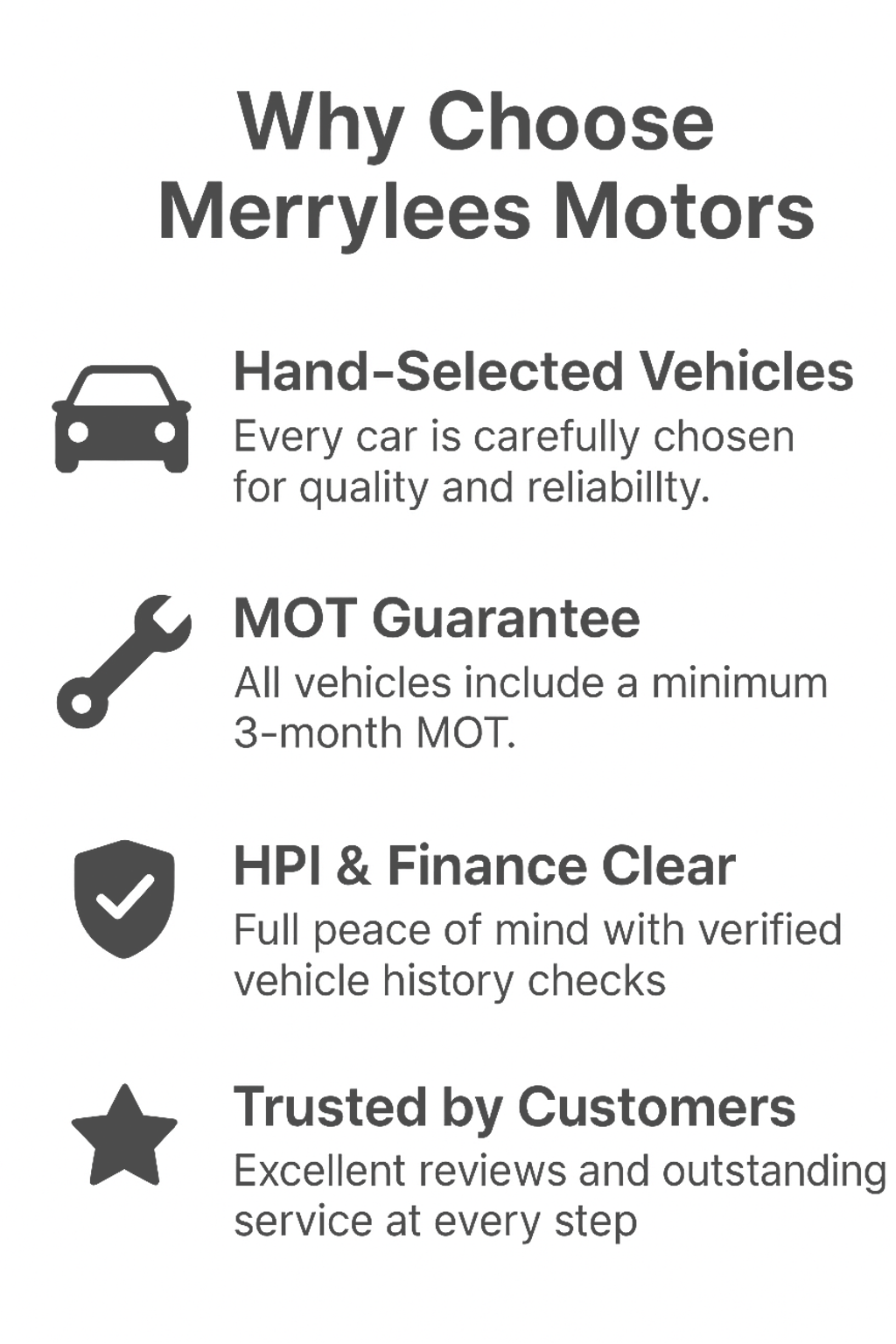 Located in the heart of Leicester, we are committed to providing our customers with not only high-quality cars but also with impeccable customer service. Our knowledgeable team is here to assist you in finding the perfect car that fits your lifestyle, ensuring a seamless and enjoyable buying experience. Explore our dynamic range of used cars in Leicester and Leicestershire today and discover why Merrylees Motors Ltd is a preferred choice for discerning car buyers.